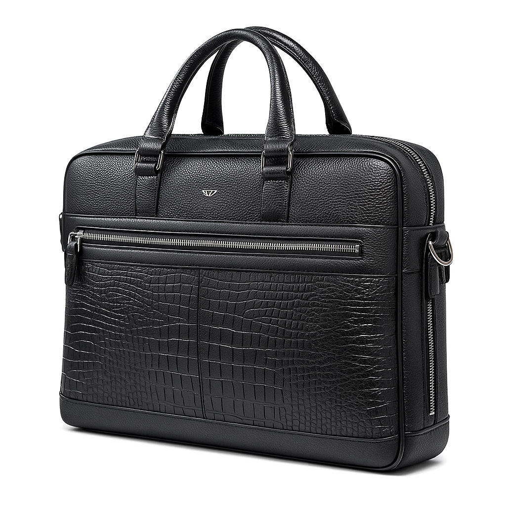 حقيبة لابتوب جلدية فاخرة ماركة تيرجان التركية تجمع بين نسيج الجلد الحبيبي والنقش الكروكو لمظهر أنيق ومميز. مزودة بجيب أمامي بسحاب معدني قوي وتصميم عملي يجعلها مثالية للعمل والسفر.