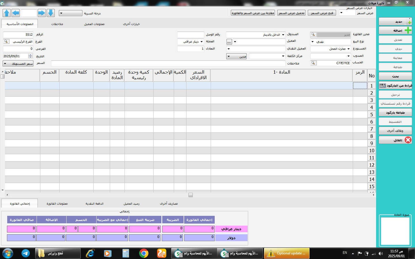 إنشاء وطباعة الفواتير بسرعة وسهولة. دعم المبيعات النقدية والآجلة وربطها بالمخزون. إمكانية إرسال الفواتير إلكترونيًا للعملاء.