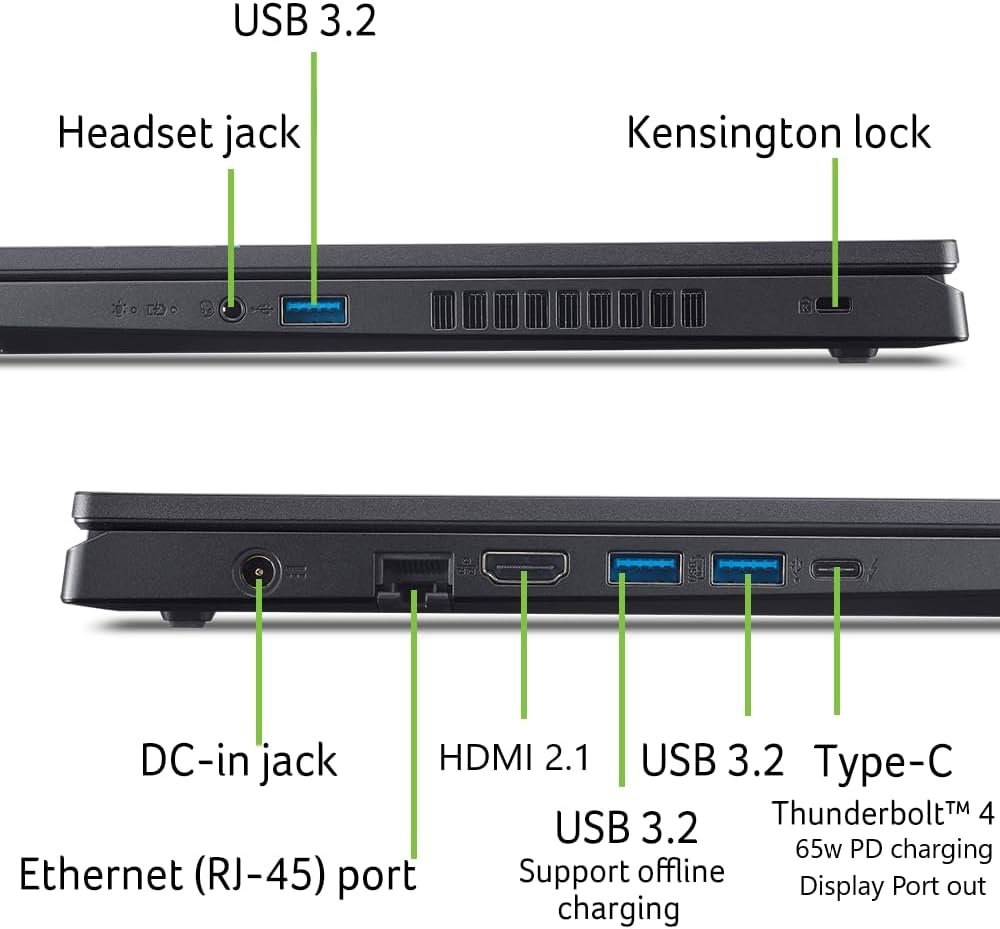 1️⃣ 3 × USB‑A 3.2 Gen1 2️⃣ 1 × USB‑C 3.2 Gen2 (بعض النسخ تدعم Thunderbolt) 3️⃣ 1 × HDMI 2.1 4️⃣ Ethernet LAN (RJ‑45) 5️⃣ مدخل سماعات 3.5 mm (Combo) 6️⃣ منفذ الشحن (Power) 7️⃣ Kensington Lock
