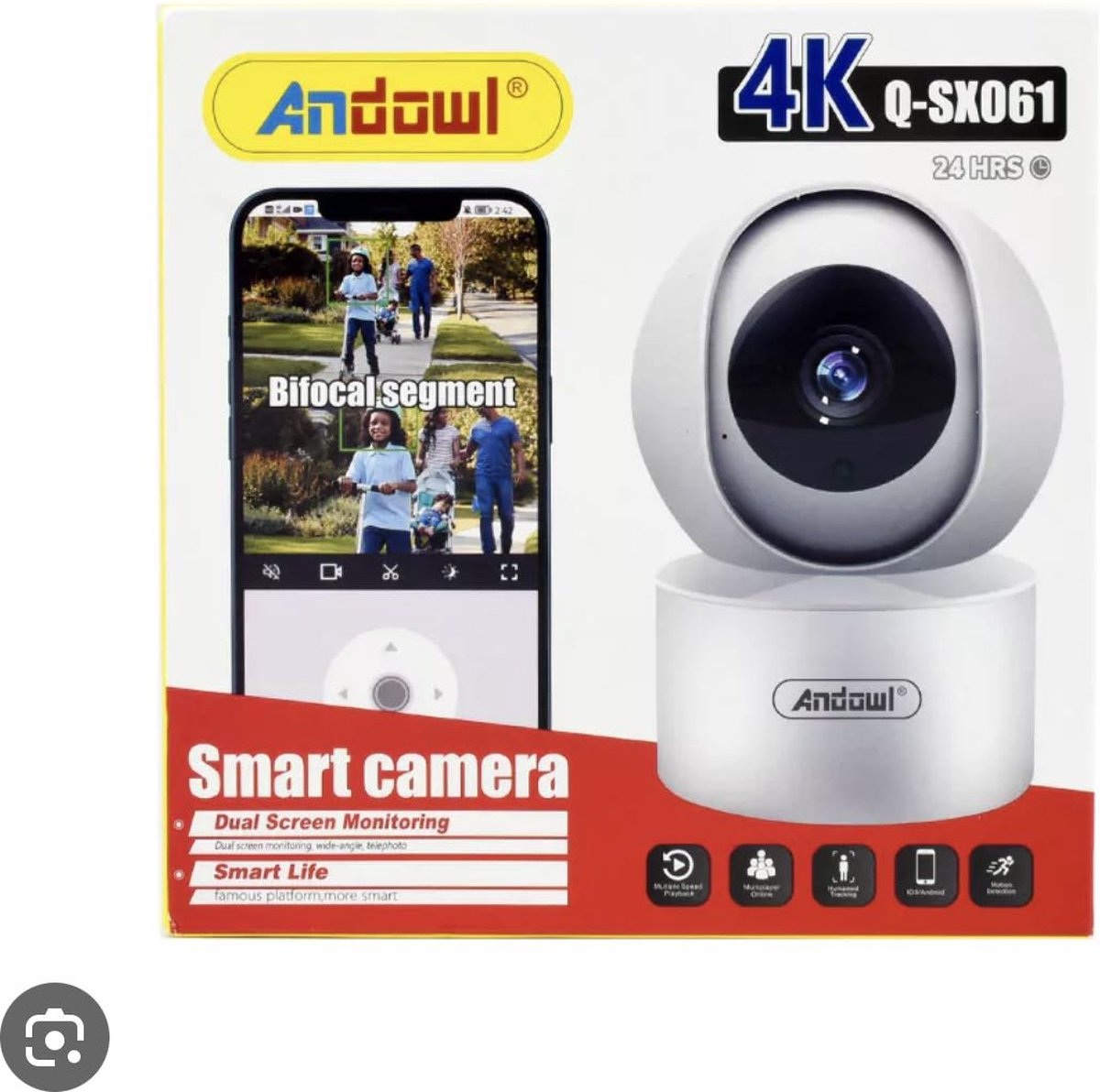 كاميرا ANDOWL Q-SX061 هي كاميرا مراقبة داخلية ذكية Wi-Fi بدقة 4K مع نظام رؤية ليلية بالأشعة تحت الحمراء وتحريك واسع للمشهد، وتدعم رؤية وتسجيل مباشر عبر التطبيق، حسّاس حركة، وتخزين على بطاقة حتى 128 GB. تتميز أيضًا بـ الميكروفون والسماعة المدمجين للتواصل ثنائي الاتجاه عبر الهاتف، وتُغذّى بتيار DC 5 V وتُناسب المراقبة المنزلية أو المكتبية.