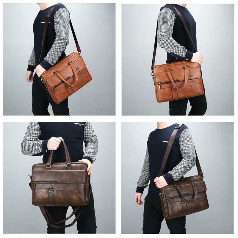حقيبة يد من الجلد الصناعي/الجلد تجمع بين الأناقة والمتانة، مقاومة للماء جزئياً وعديمة تقشّف. تحتوي على حجرة مبطنة لحماية اللابتوب + حجرة جانبية وحزام كتف لتسهيل الحمل. تصميم رسمي عملي مناسب للعمل أو الاجتماعات.