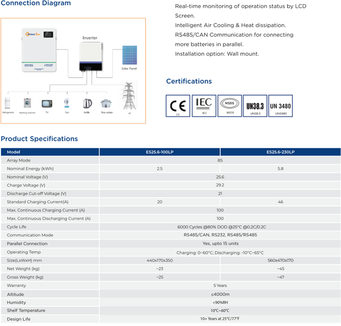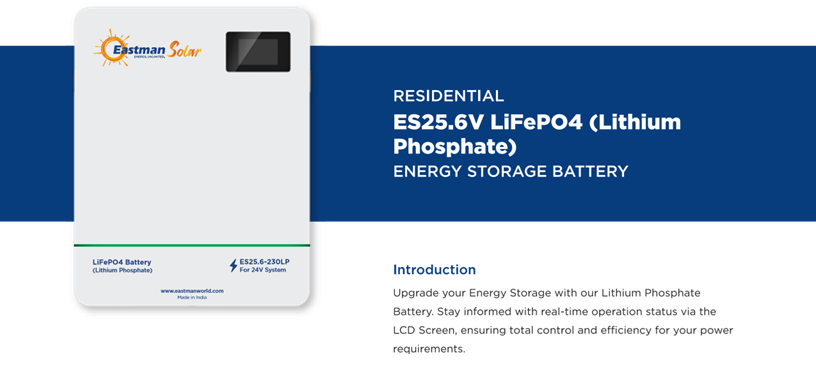 بطارية Eastman LiFePO₄ بجهد اسمي 25.6 V، وسعة طاقة حوالي 5.8 kWh (تُعرف أحيانًا بـ 5.8 kW إذا ما دُلّلت على الطاقة القصوى)، تُوفر دورانًا كهربائيًا يصل إلى 6000 دورة عند 80 % عمق تفريغ، مع دعم لتوصيل متوازي (حتى 15 وحدة)، وتضم وحدات تواصل RS485/CAN لدمجها بسلاسة ضمن أنظمة الطاقة الاحتياطية المنزلية أو الخلوية.