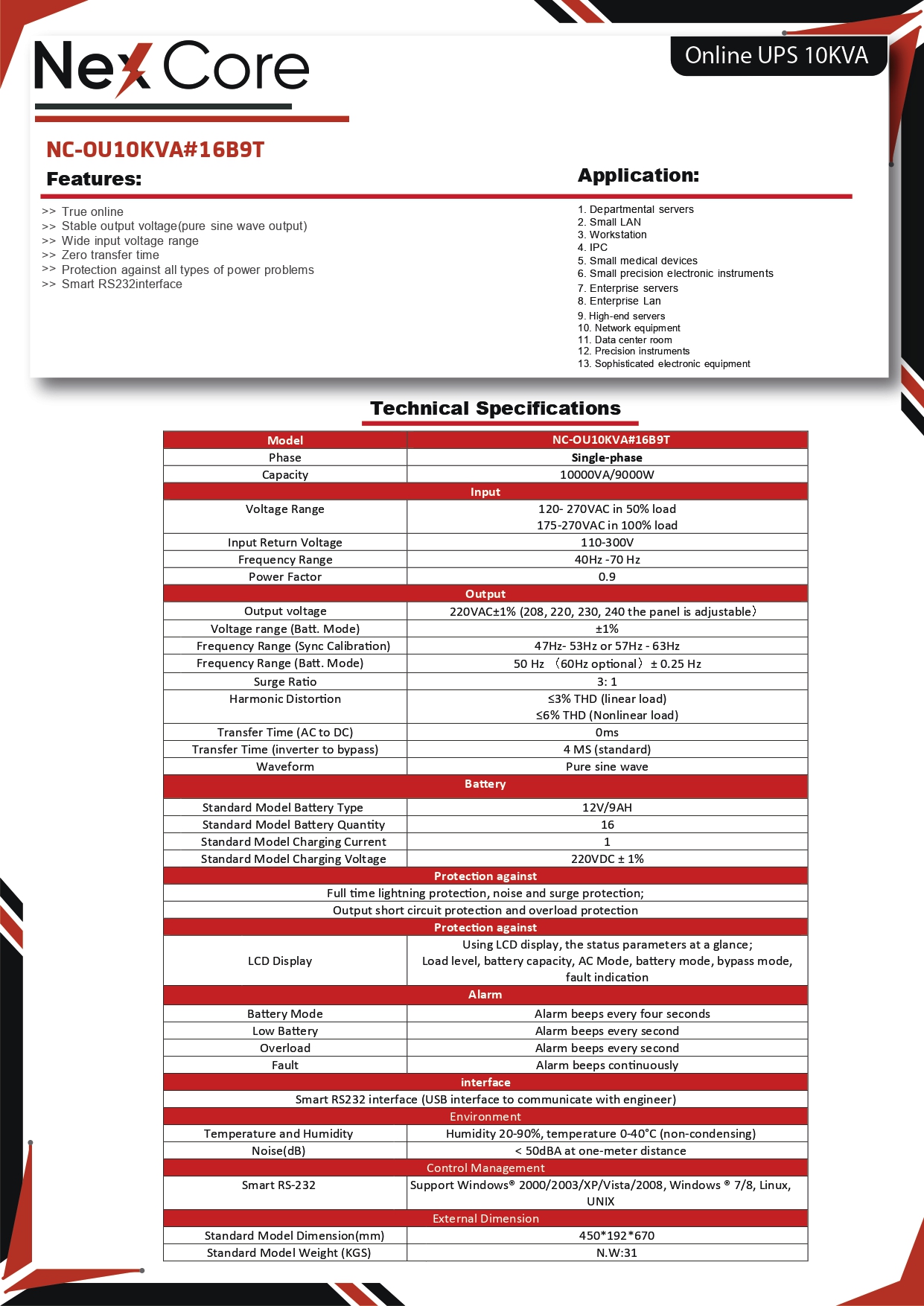 جهاز UPS أونلاين بقوة 10kVA / 9000 W، بمنظومة بطاريات مكونة من 16 خلية 12V-9 Ah، مصمم لتوفير طاقة احتياطية عالية ووقت تحويل صفر تقريباً، مع ضمان لمدة سنة. مثالي للمحطات الحرجة مثل الخوادم، أنظمة الاتصالات، ونقاط البيع، مع حماية كاملة ضد انقطاع التيار، وخرج موجة جيبية نقية وثبات عالي في الجهد والتردد.