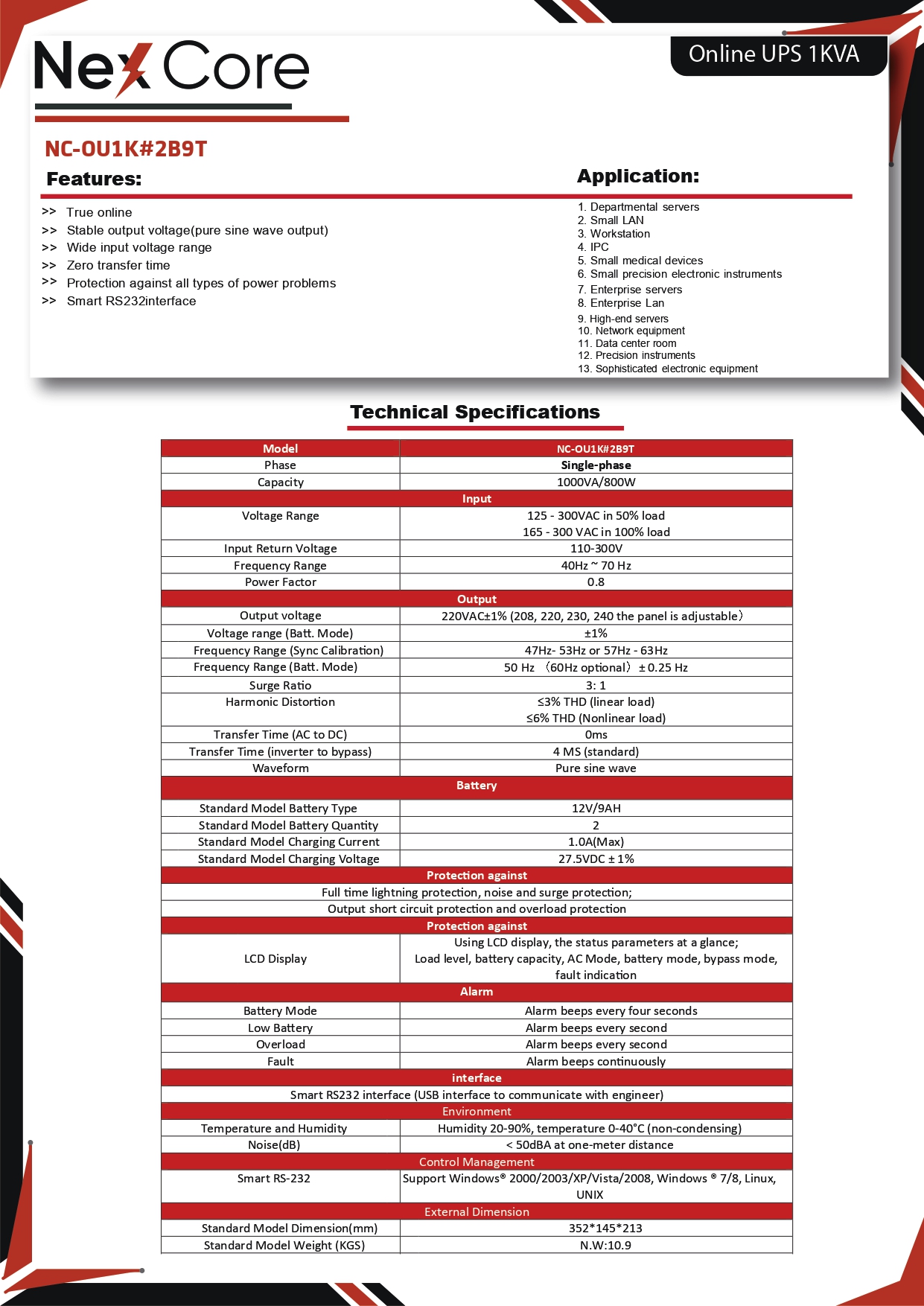 جهاز UPS أونلاين بقوة 1kVA / 800 W، مزود بـ بطاريتين 12V-9 Ah (2-BT)، يقدم حماية كاملة ضد انقطاع التيار الكهربائي مع موجة جيبية نقية، ويأتي مع ضمان لمدة سنة. مثالي للأجهزة المنزلية المكتبية الصغيرة، أجهزة الشبكة، أو نقاط البيع ذات الحمل المتوسط بفضل التصميم المضغوط والتحويل اللحظي للطاقة.