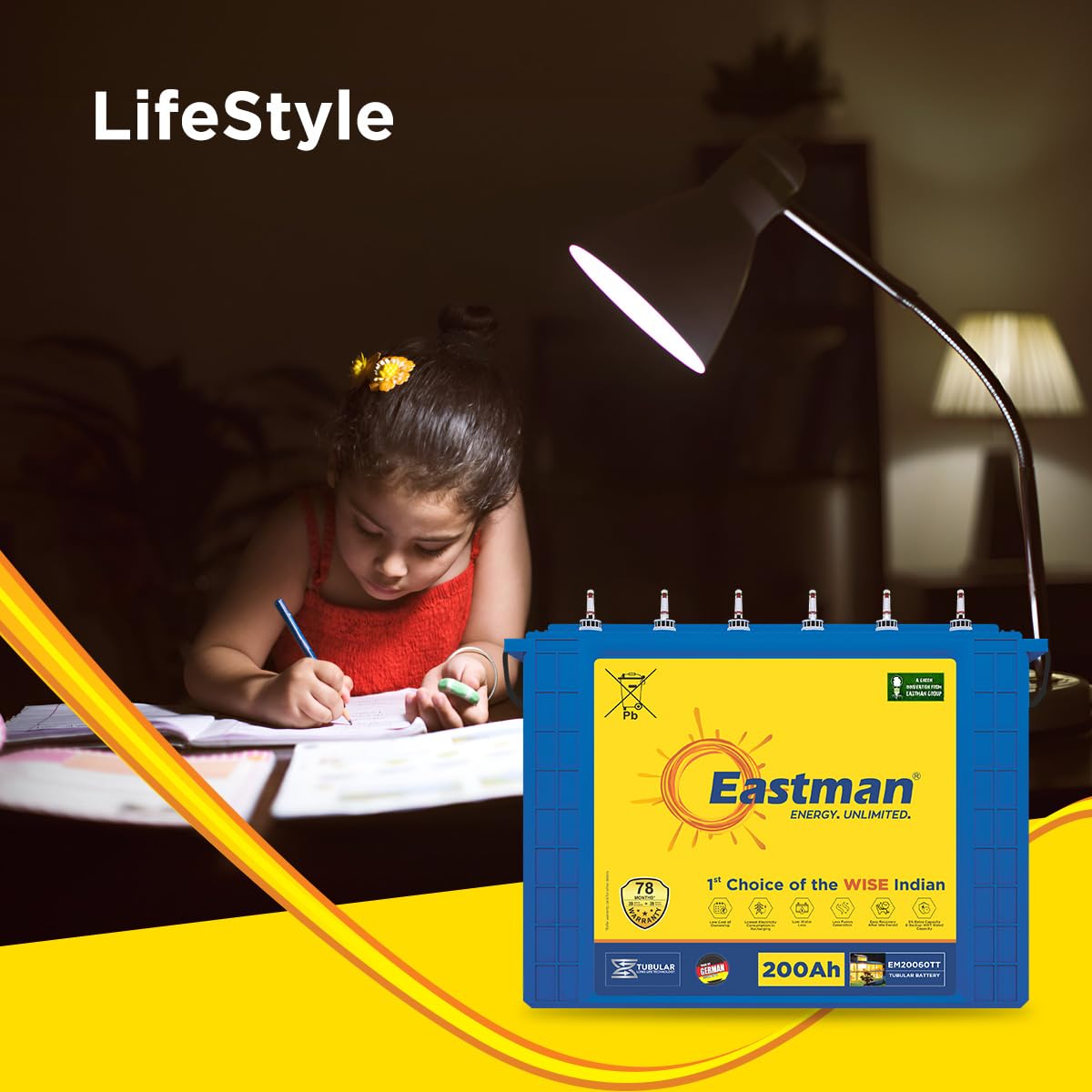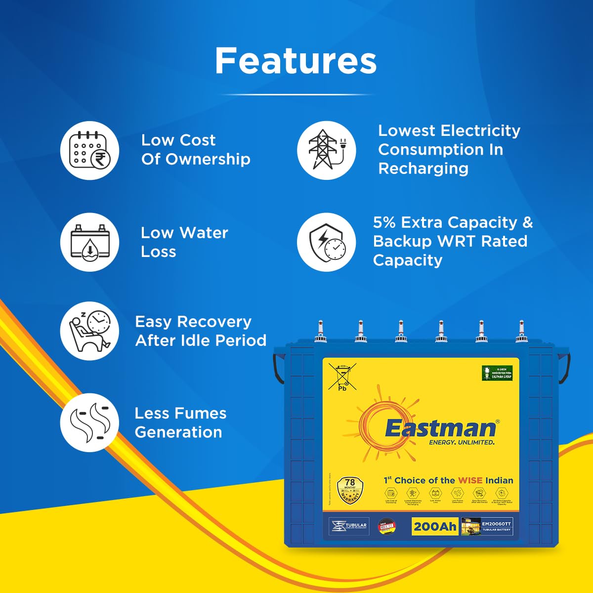 بطارية EASTMAN TUBULAR 12V 200Ah (C20) عالية الكفاءة، مصممة للاستخدام الطويل مع أنظمة الطاقة الشمسية والإنفرترات. توفر أداءً ثابتًا، عمرًا افتراضيًا أطول، وتحملًا ممتازًا لدورات الشحن والتفريغ العميقة.