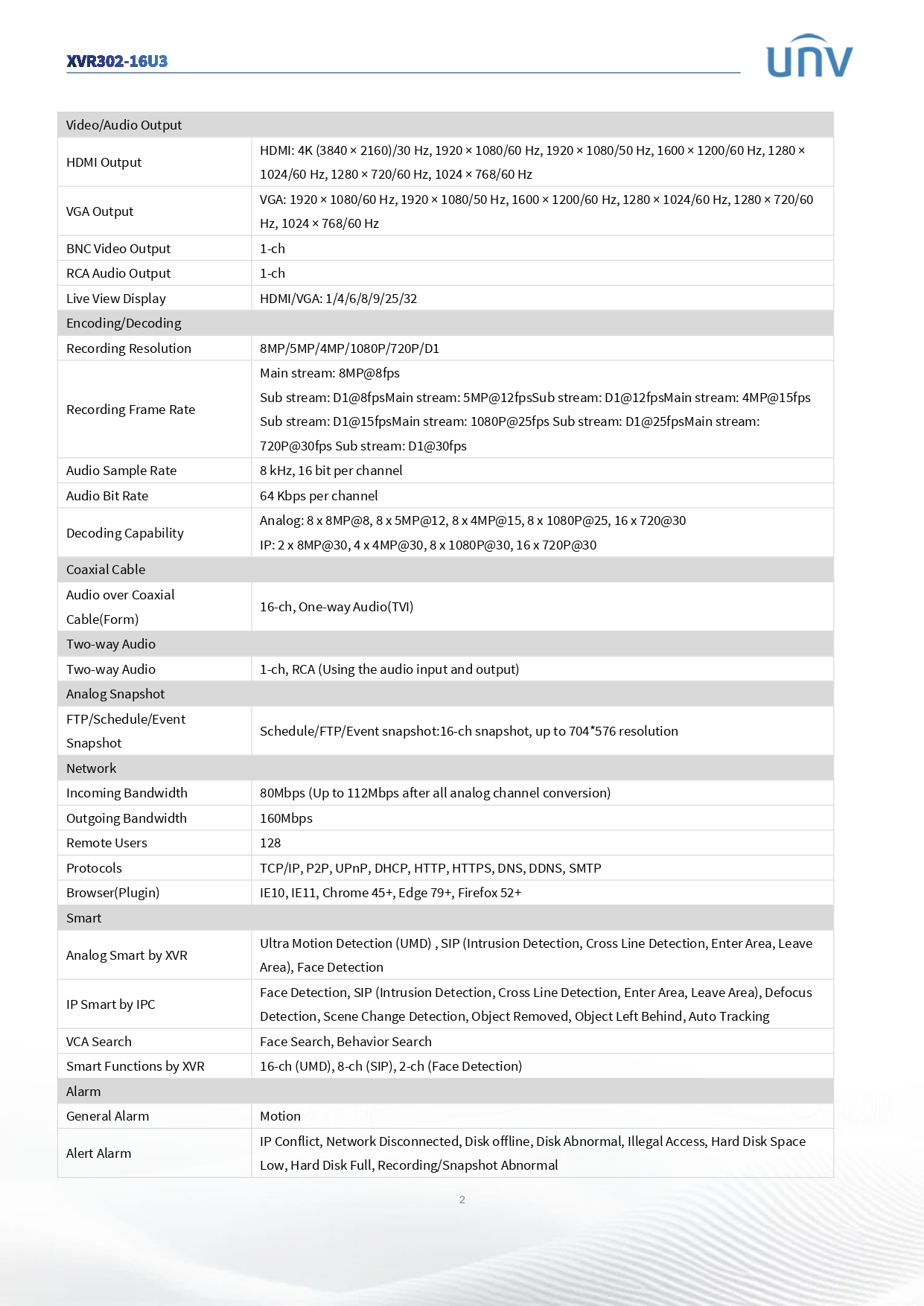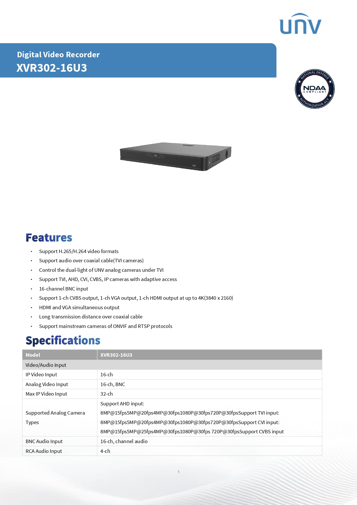 • دعم صيغ الفيديو H.265/H.264 • دعم الصوت عبر الكابل المحوري (كاميرات TVI) • التحكم في الإضاءة المزدوجة لكاميرات UNV التناظرية عبر TVI • دعم كاميرات TVI، AHD، CVI، CVBS، وكاميرات IP مع إمكانية الوصول التكيفي • مدخل BNC بـ 16 قناة • دعم مخرج CVBS أحادي القناة، ومخرج VGA أحادي القناة، ومخرج HDMI أحادي القناة بدقة تصل إلى 4K (3840 × 2160) • مخرج HDMI وVGA متزامن • مسافة نقل طويلة عبر الكابل المحوري • دعم الكاميرات الرئيسية التي تعمل ببروتوكولي ONVIF وRTSP