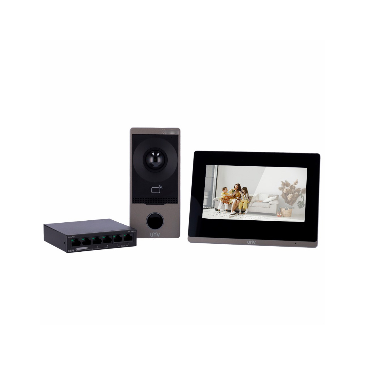 Uniview طقم الاتصال الداخلي عبر الفيديو تكنولوجيا IP و WiFi تتكون المجموعة من: لوحة دخول لباب الفيديو السطحي الخارجي UV-OEU-201S-HMK-W مع كاميرا عالية الدقة بدقة 2 ميجابكسل، وشاشة WiFi داخلية UV-OEI-372S-H-W مع شاشة TFT LCD مقاس 7 بوصات وشاشة UV-NSW2020-6T-POE- قارئ بطاقة MF المراقبة عبر تطبيق الهاتف المحمول UNV-Link