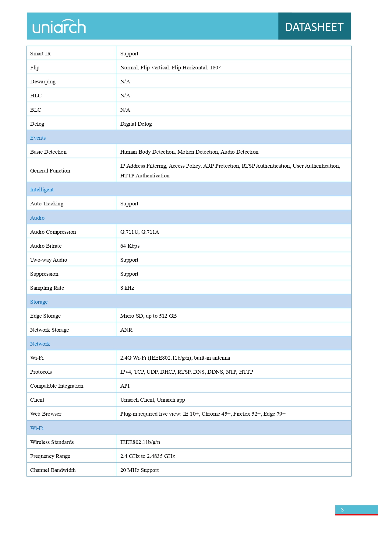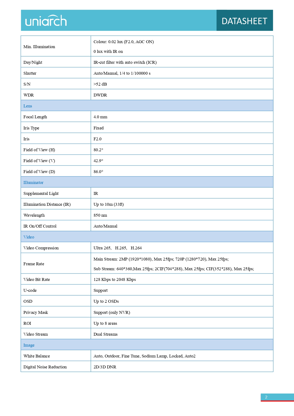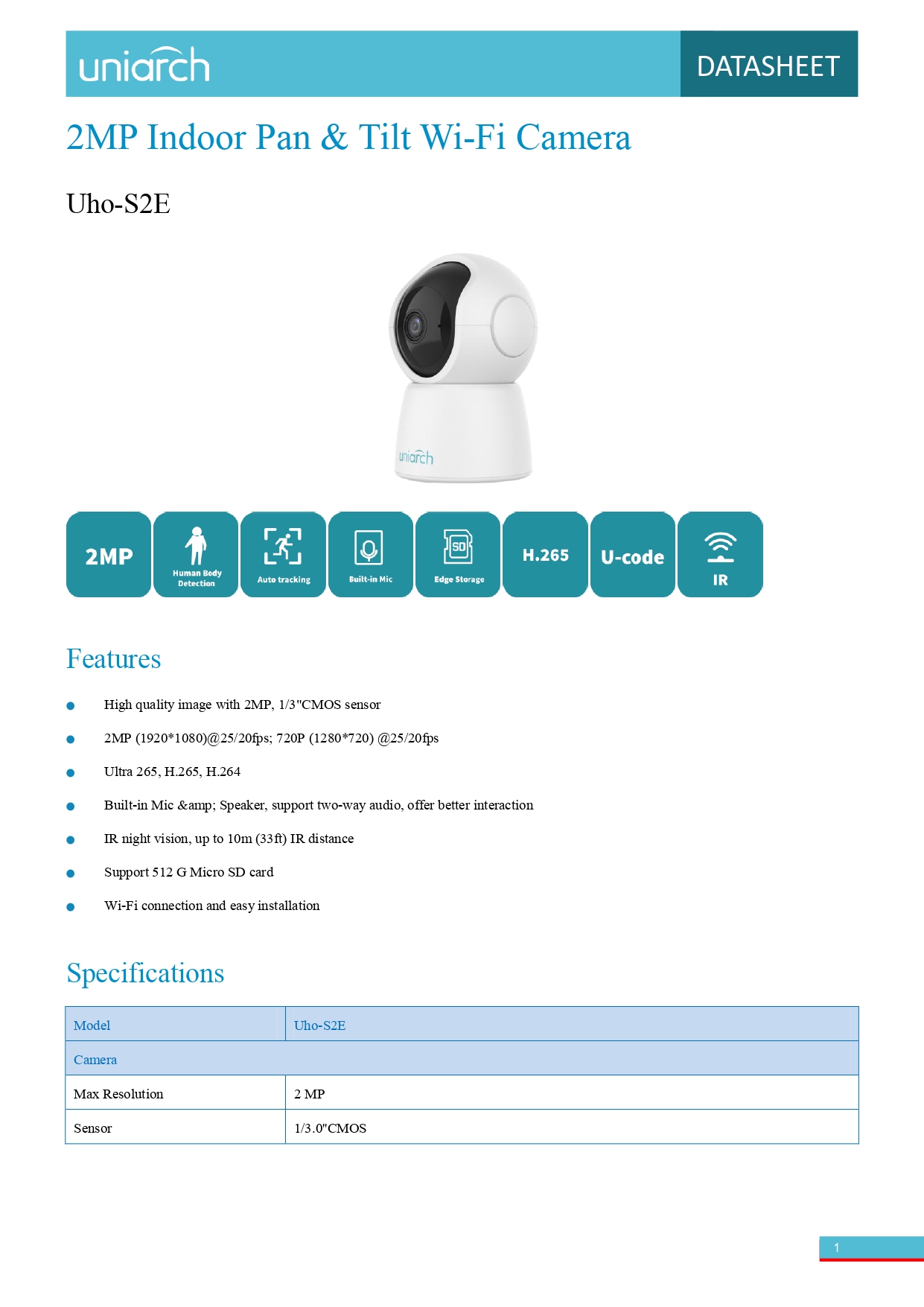 -صورة عالية الجودة مع مستشعر CMOS بدقة ٢ ميجابكسل، مقاس ١/٣ بوصة -٢ ميجابكسل (١٩٢٠*١٠٨٠) بمعدل ٢٥/٢٠ إطارًا في الثانية؛ ٧٢٠ بكسل (١٢٨٠*٧٢٠) بمعدل ٢٥/٢٠ إطارًا في الثانية -Ultra 265، H.265، H.264 -ميكروفون ومكبر صوت مدمجان، يدعمان الصوت ثنائي الاتجاه، ويوفران تفاعلًا أفضل -رؤية ليلية بالأشعة تحت الحمراء، حتى مسافة ١٠ أمتار (٣٣ قدمًا) -دعم بطاقة ذاكرة Micro SD بسعة ٥١٢ جيجابايت -اتصال واي فاي وسهولة التركيب