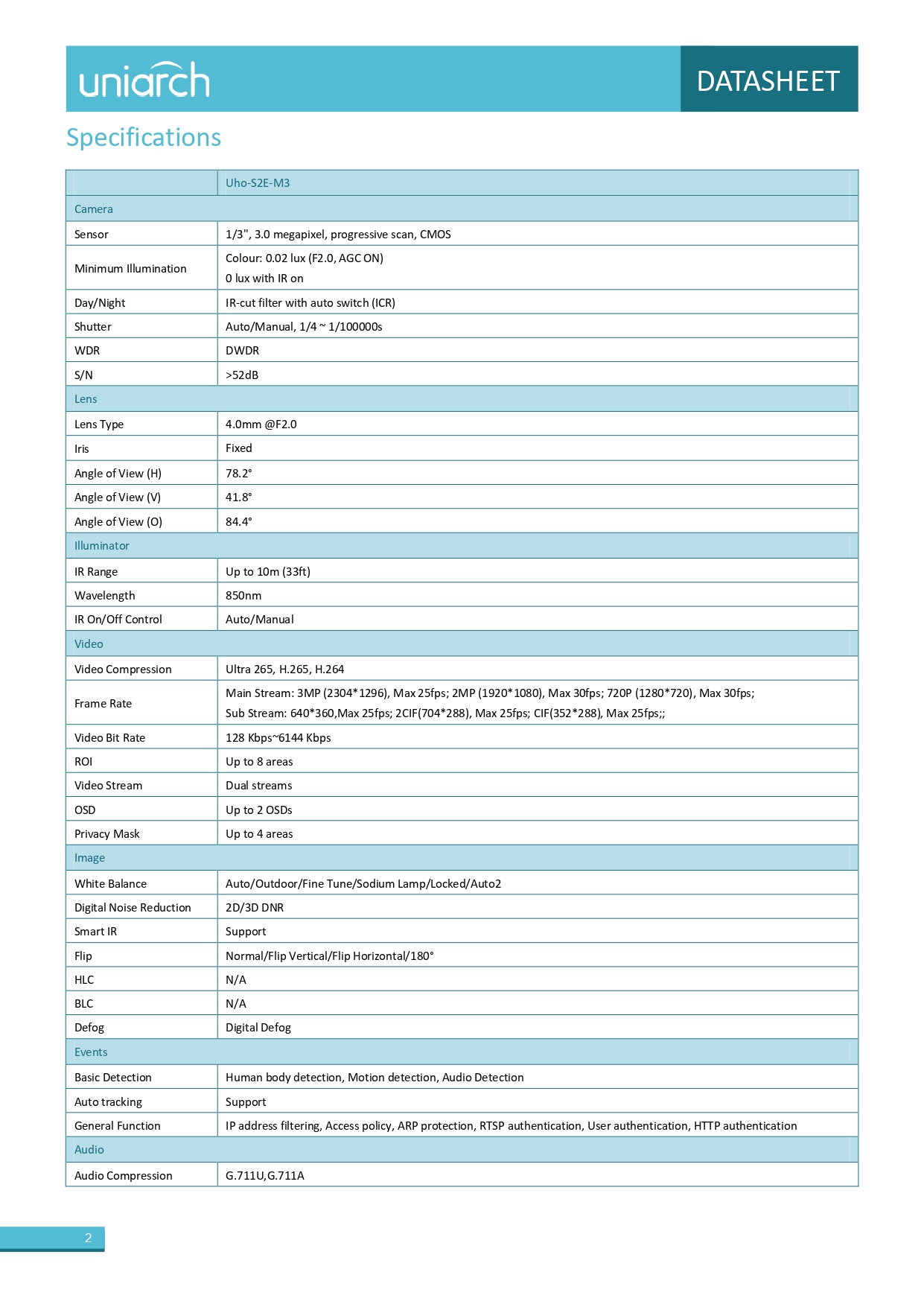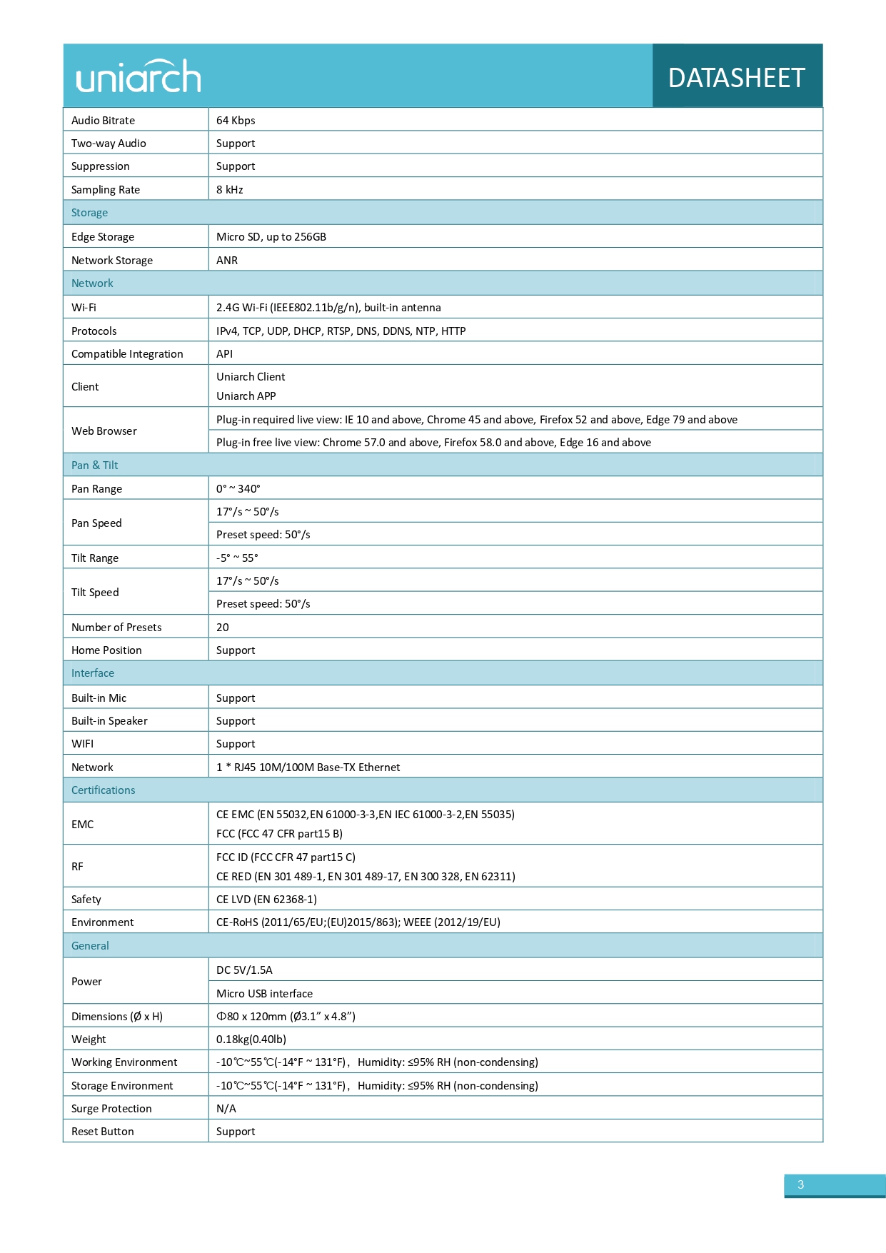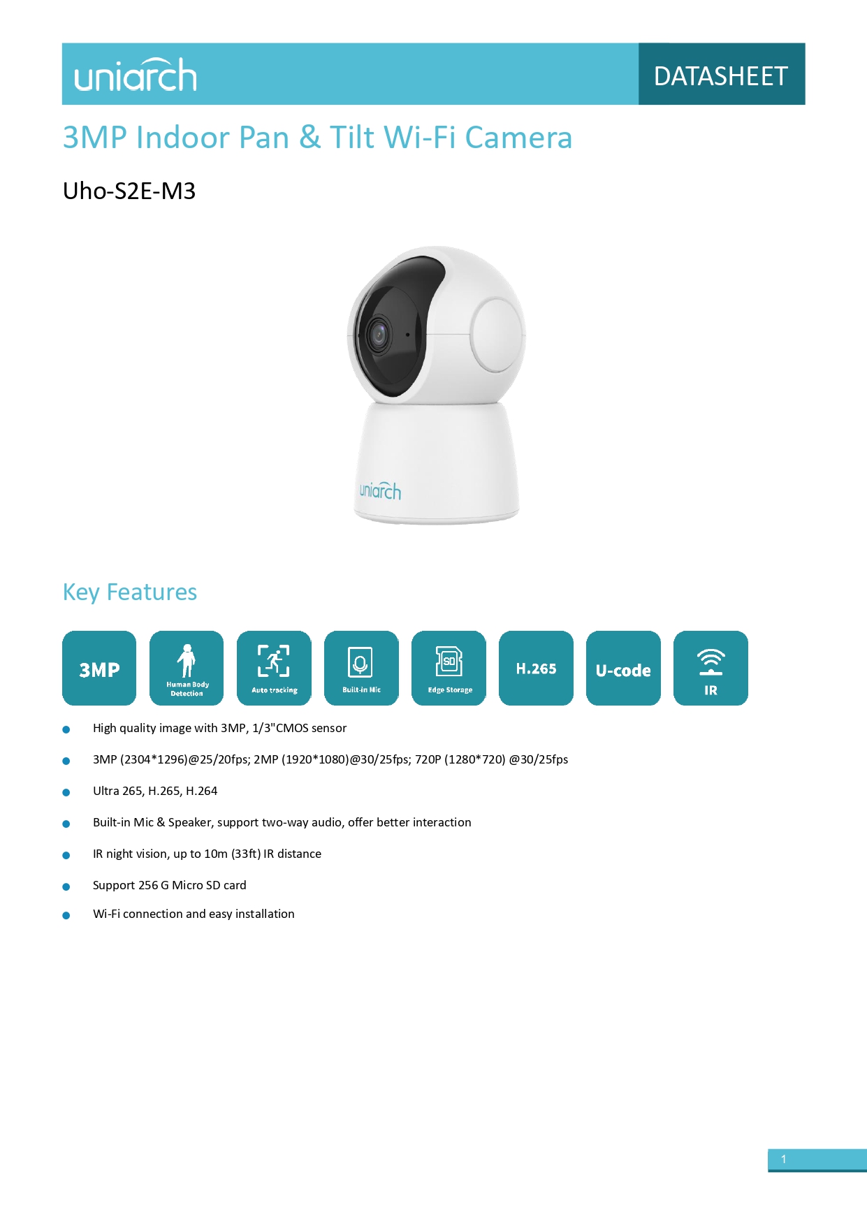 • صورة عالية الجودة مع مستشعر CMOS بدقة 3 ميجابكسل، مقاس 1/3 بوصة • 3 ميجابكسل (2304*1296) بمعدل 25/20 إطارًا في الثانية؛ 2 ميجابكسل (1920*1080) بمعدل 30/25 إطارًا في الثانية؛ 720 بكسل (1280*720) بمعدل 30/25 إطارًا في الثانية • Ultra 265، H.265، H.264 • ميكروفون ومكبر صوت مدمجان، يدعمان الصوت ثنائي الاتجاه، ويوفران تفاعلًا أفضل • رؤية ليلية بالأشعة تحت الحمراء، حتى مسافة 10 أمتار (33 قدمًا) • يدعم بطاقة ذاكرة Micro SD بسعة 256 جيجابايت • اتصال واي فاي وسهولة التركيب