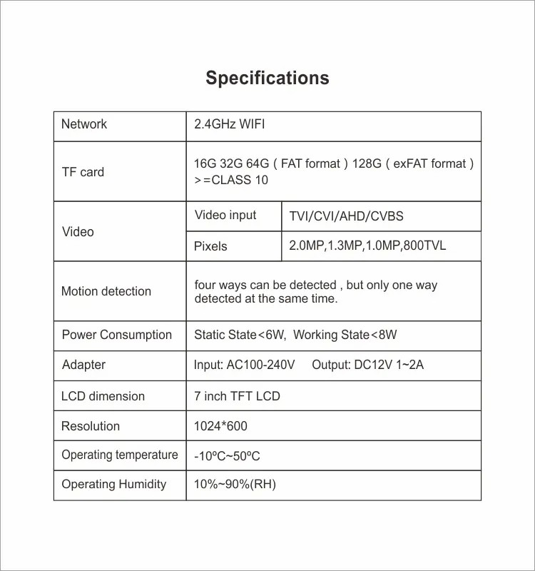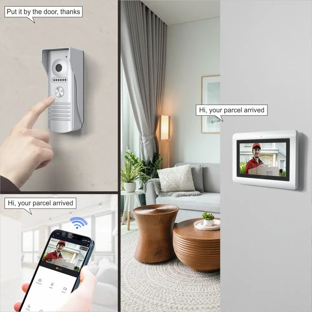 ✅ المواصفات -شاشة لمس بحجم 7 إنش لعرض الصورة والمحادثات. -كاميرا بدقة AHD تقريبًا 2 ميجابيكسل مع دعم الرؤية الليلية. -تخزين داخلي يدعم بطاقة ذاكرة (TF) حتى 128 جيجا بايت لتسجيل الصور والفيديو. -يعمل عبر الواي-فاي ويمكن الربط مع تطبيق هاتف ذكي للتحكم والمراقبة عن بُعد.