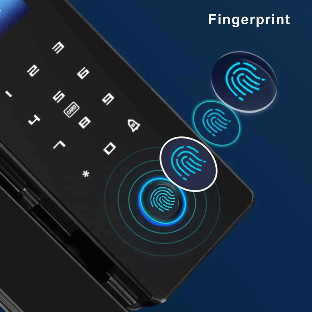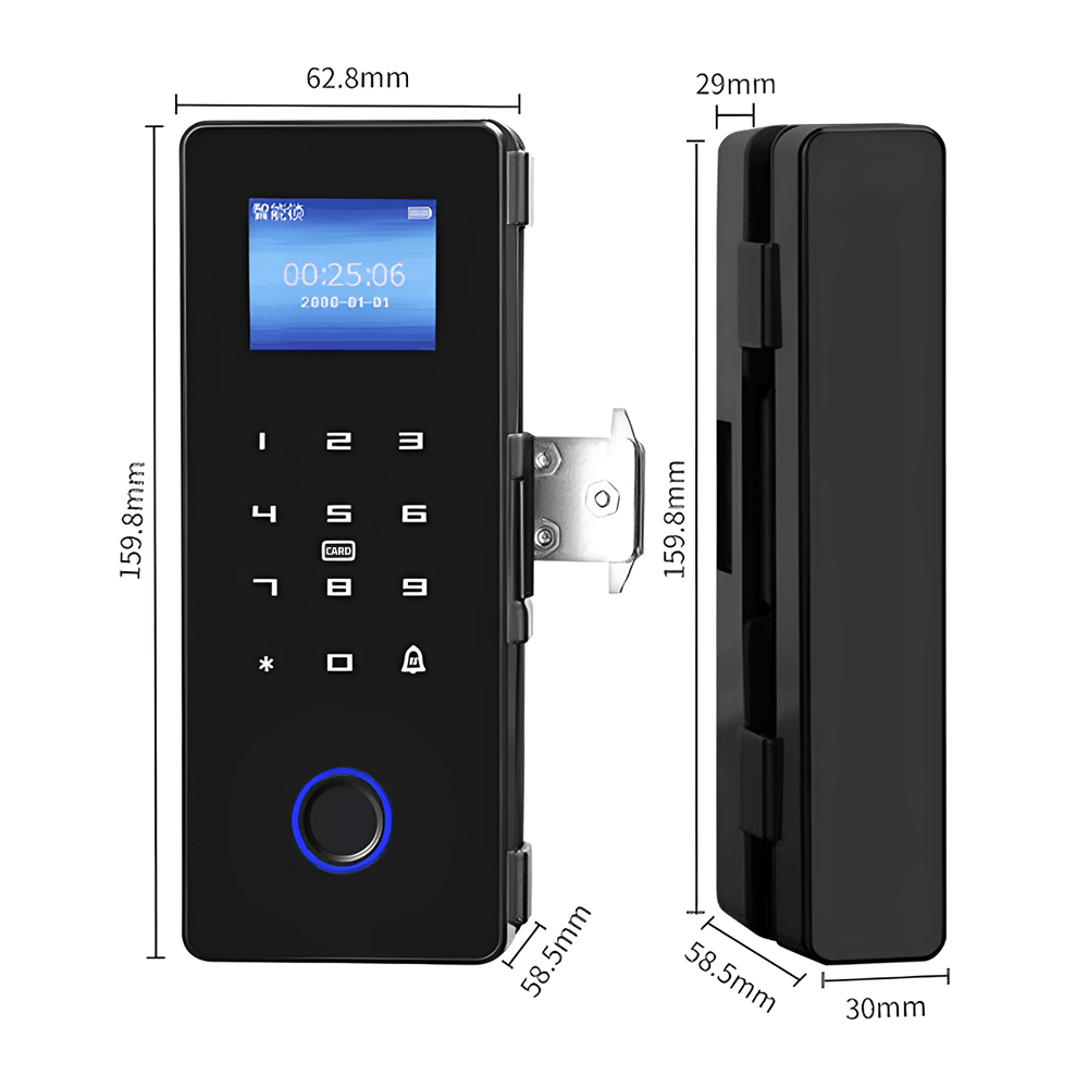 قفل باب ذكي للأبواب الزجاجية يتميز بلوحة أرقام تعمل باللمس وشاشة رقمية لعرض الوقت والبيانات. يوفر خيارات أمان متعددة تشمل التعرف على بصمة الإصبع، واستخدام البطاقات الممغنطة، وكلمات المرور لضمان وصول آمن وسهل.